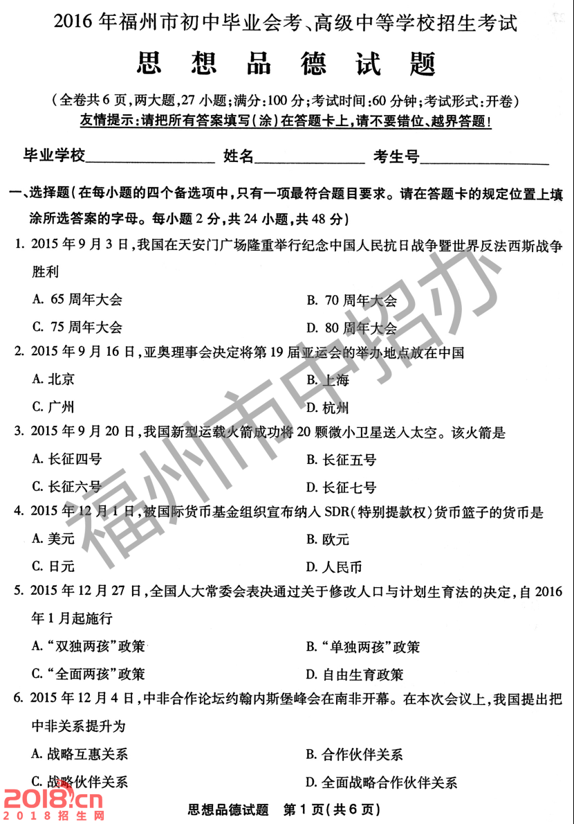 2016年福州市中考思想品德试卷及参考答案 完整版下载
