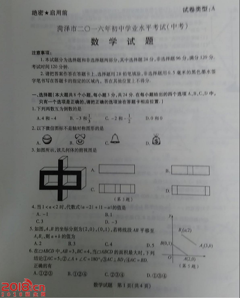 2016年菏泽市中考数学试卷及答案下载 2016菏泽中考数学试卷word 菏泽中考数学试题答案清晰图片版