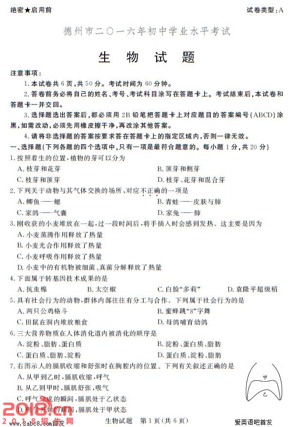 2016年德州中考生物试题及答案