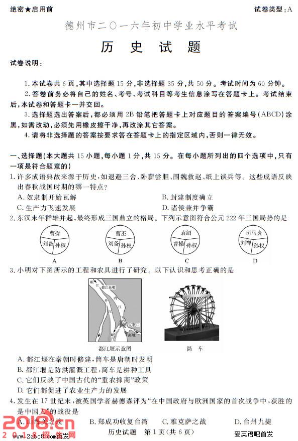2016年德州中考历史试题及答案