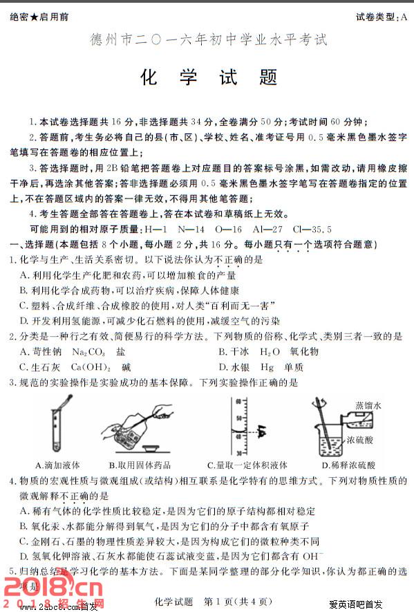 2016年德州市中考化学试卷及答案下载 2016德州中考化学试卷word 德州中考化学试题答案清晰图片版