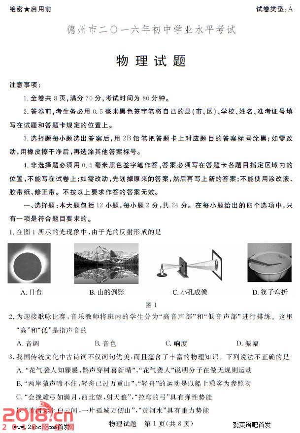 2016年德州市中考物理试卷及答案下载 2016德州中考物理试卷word 德州中考物理试题答案清晰图片版