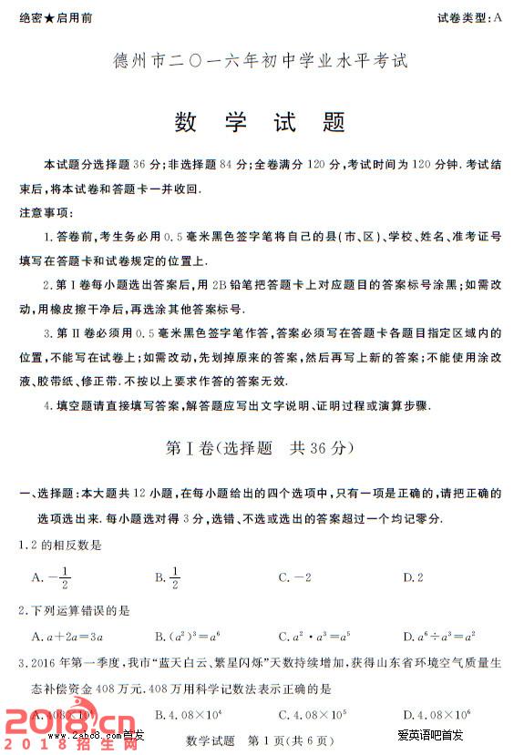 2016年德州市中考数学试卷及答案下载 2016德州中考数学试卷word 德州中考数学试题答案清晰图片版