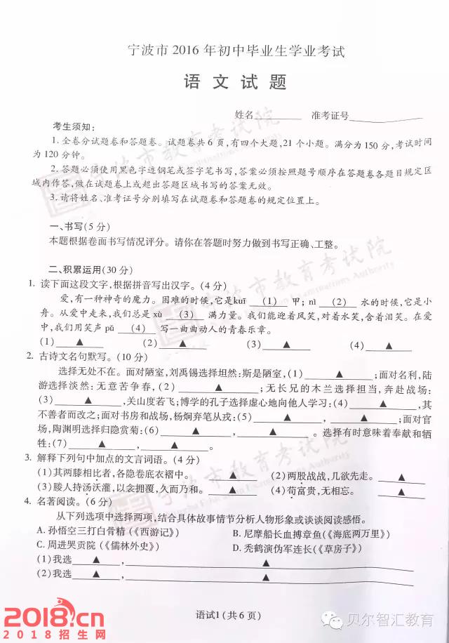 2016年宁波中考语文试题及答案