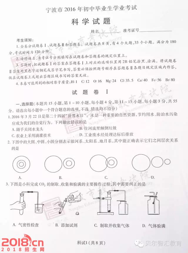 2016年宁波市中考科学试卷及答案下载 2016宁波中考科学试卷word 宁波中考科学试题答案清晰图片版