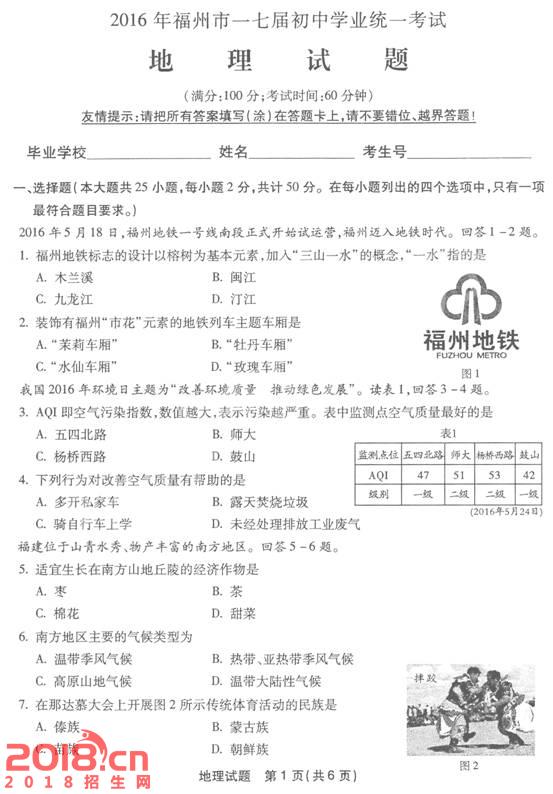 2016年福州市中考地理试卷及答案下载 2016福州中考地理试卷word 福州中考地理试题答案清晰图片版