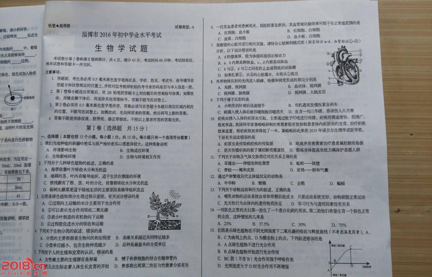 2016年淄博市中考生物试卷及答案下载 2016淄博中考生物试卷word 淄博中考生物试题答案清晰图片版