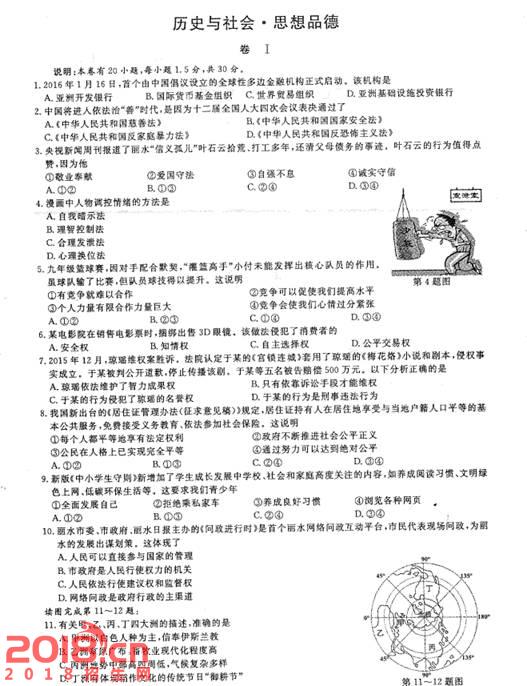 2016年丽水市中考思想品德历史试卷及答案下载 2016丽水中考思想品德历史试卷word 丽水中考思想品德历史试题答案清晰图片版