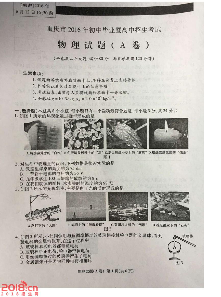 2016年重庆市中考物理A试卷及答案下载 2016重庆中考物理A试卷word 重庆中考物理A试题答案清晰图片版