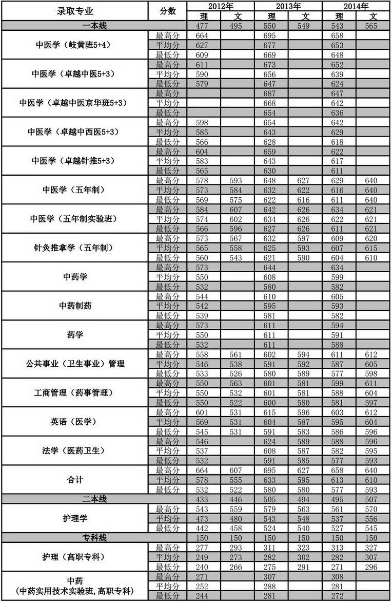 北京中医药大学2014年录取分数线 北京中医药大学北京近三年各专业录取分数线统计