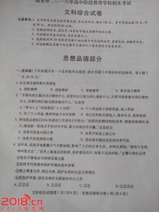 2016年南充市中考政治试卷及答案下载 2016南充中考政治试卷word 南充中考政治试题答案清晰图片版