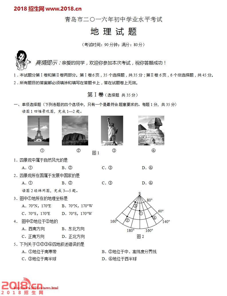 2016年青岛市中考地理试卷及答案下载 2016青岛中考地理试卷word 青岛中考地理试题答案清晰图片版