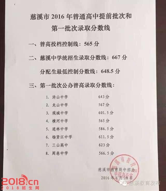 2016年慈溪市横河中学录取分数线公布 2016年慈溪市普通高中提前批次和第一批次录取分数线。2016慈溪横河中学录取分数线565分