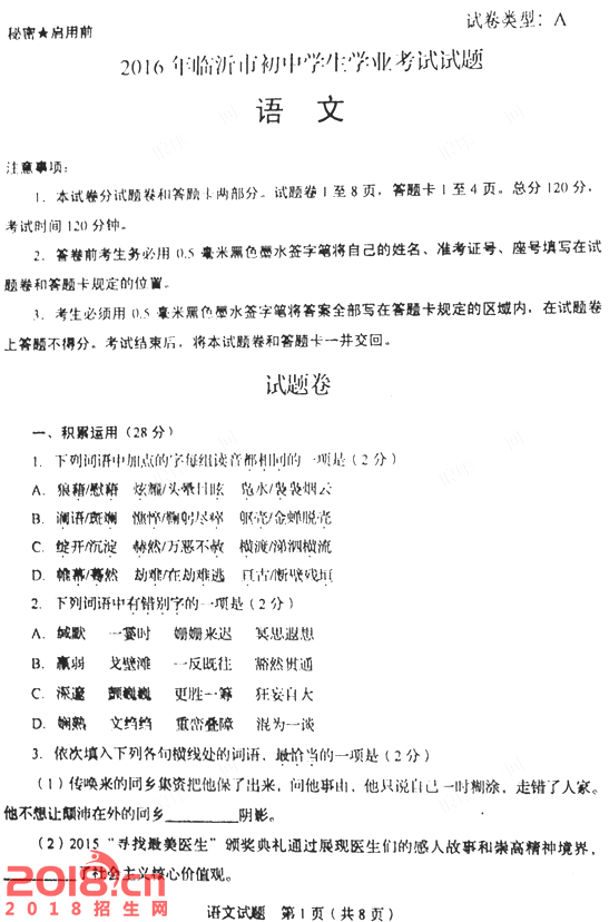 2016年临沂市中考语文试卷及答案下载 2016临沂中考语文试卷word 临沂中考语文试题答案清晰图片版