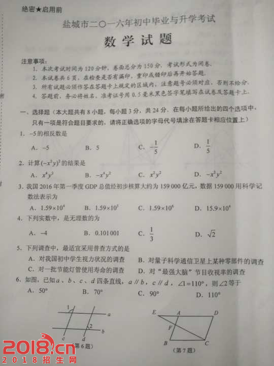 2016年盐城市中考数学试卷及答案下载 2016盐城中考数学试卷word 盐城中考数学试题答案清晰图片版
