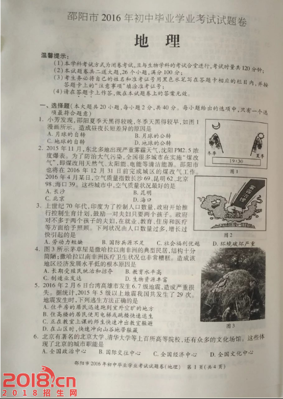 2016年邵阳市中考地理试卷及答案下载 2016邵阳中考地理试卷word 邵阳中考地理试题答案清晰图片版