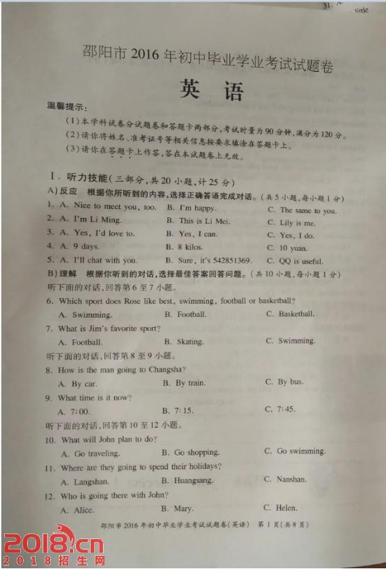 2016年邵阳市中考英语试卷及答案下载 2016邵阳中考英语试卷word 邵阳中考英语试题答案清晰图片版