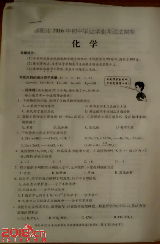 2016年邵阳市中考化学试卷及答案下载 2016邵阳中考化学试卷word 邵阳中考化学试题答案清晰图片版
