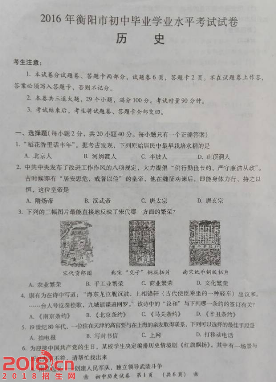 2016年衡阳市中考历史试卷及答案下载 2016衡阳中考历史试卷word 衡阳中考历史试题答案清晰图片版