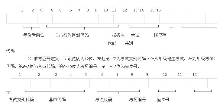 (1)报名号定义:字段宽度16位,左起第1-2位为年份后两位,第3-8位为县市行政区划代码,第9-11位为报名点代码,第12位为考试类别代码(2-八年级地生考试;3-九年级考试),第13-16位为顺序号。