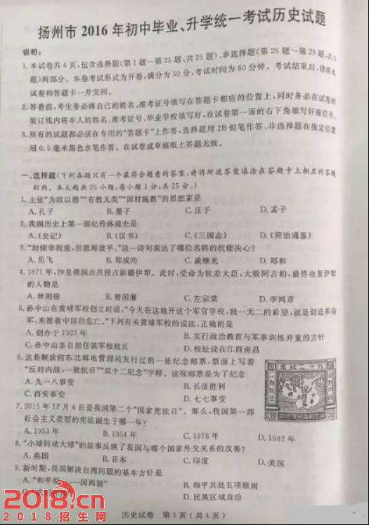 2016年扬州市中考历史试卷及答案下载 2016扬州中考历史试卷word 扬州中考历史试题答案清晰图片版