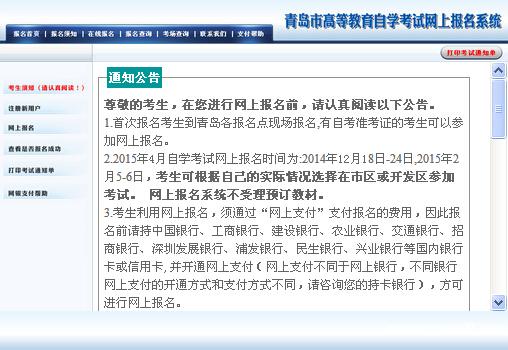2015山东青岛自考网上报名时间开始,报名系统网址入口:http://www.qdzk.com/zikao/ (点击进入青岛市高等教育自学考试网上报名系统)