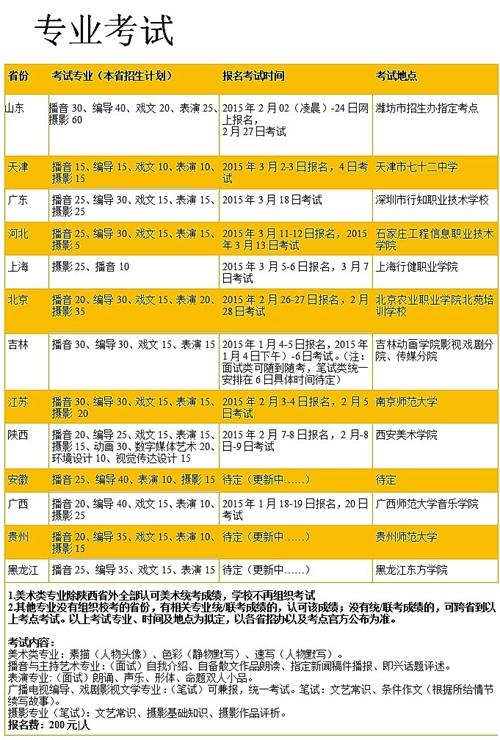 2.其他专业:没有组织校考的其他省份,有相关专业统/联考成绩的,认可该成绩;没有统/联考成绩的,可跨省到以下考点考试。录取时按专业*0.4+文化*0.6排名(表演专业按专业成绩排名,播音专业按文化*0.4+专业*0.6录取)。