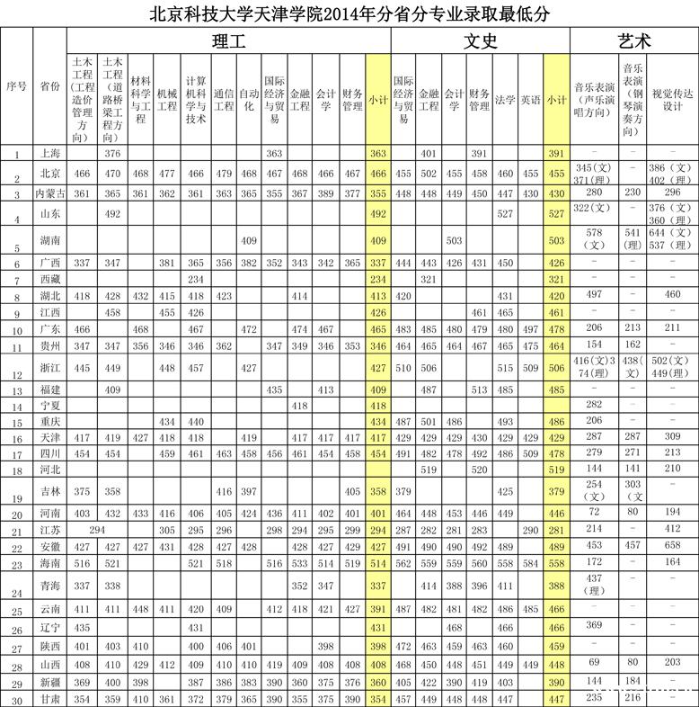 北京科技大学天津学院2014年各省录取分数线(点击图片放大查看完整数据)