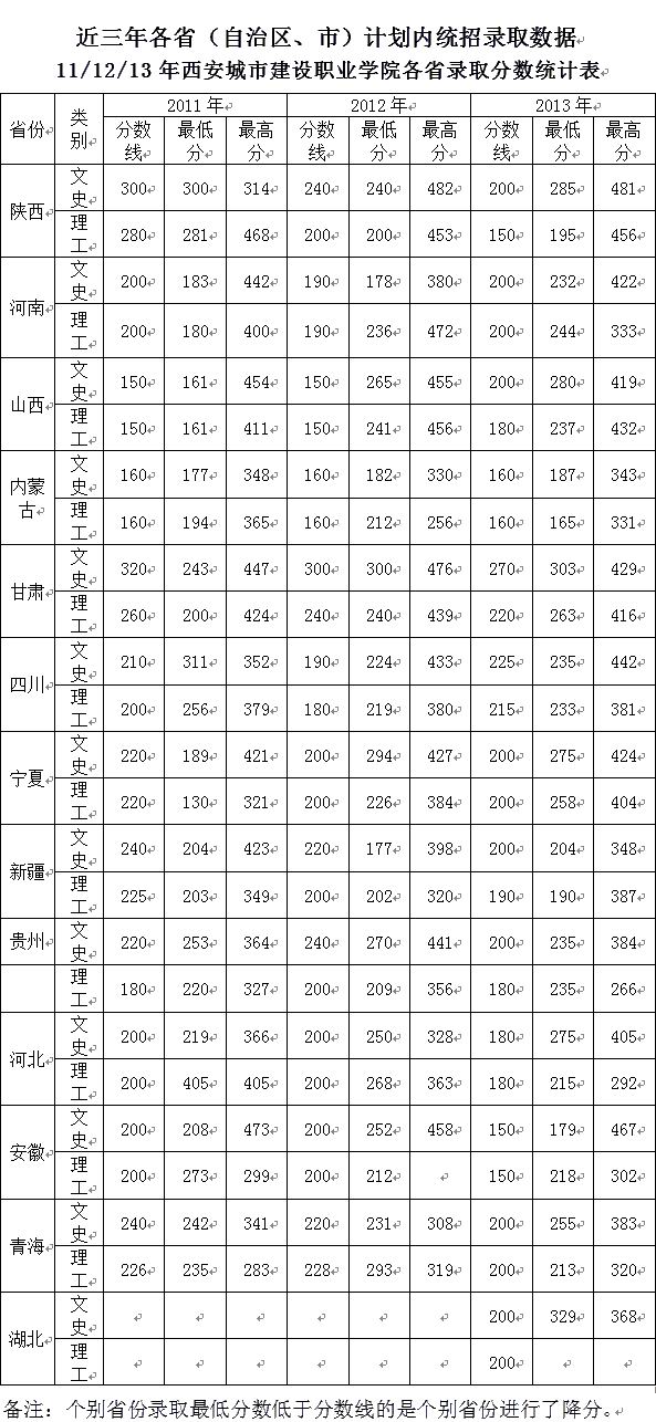 11/12/13年西安城市建设职业学院各省录取分数统计表