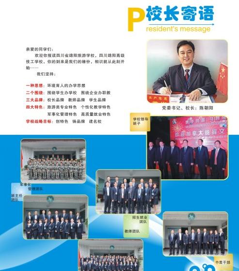 四川绵阳高级技工学校是经国家人力资源和社会保障部批准成立的一所培养高技能人才的国家级重点技校,毕业生享受国民教育大学专科待遇。 四川省绵阳旅游学校是经四川省教育厅批准成立,由绵阳市人民政府举办的一所全日制普通中专学校。 学校是绵阳市甲级校风示范学校、园林式学校、最佳文明单位、农民工培训示范基地、旅游人才培训示范机构、创业培训基地、四川省职业培训综合基地、四川省中小企业培训示范机构、四川省合作事业先进单位、国家级重点学校。