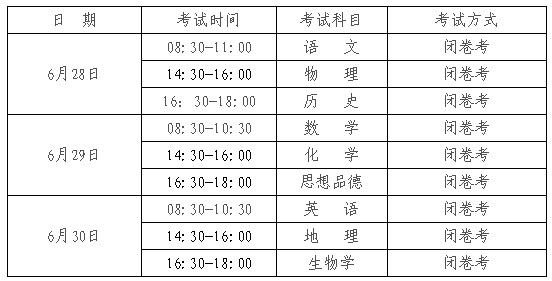 根据《云南省初中学生学业水平考试方案(试行)公开征求意见稿》得知,2015年云南中考文化课考试时间为6月28日-30日,本次云南中考具体考试科目及时间安排如下: