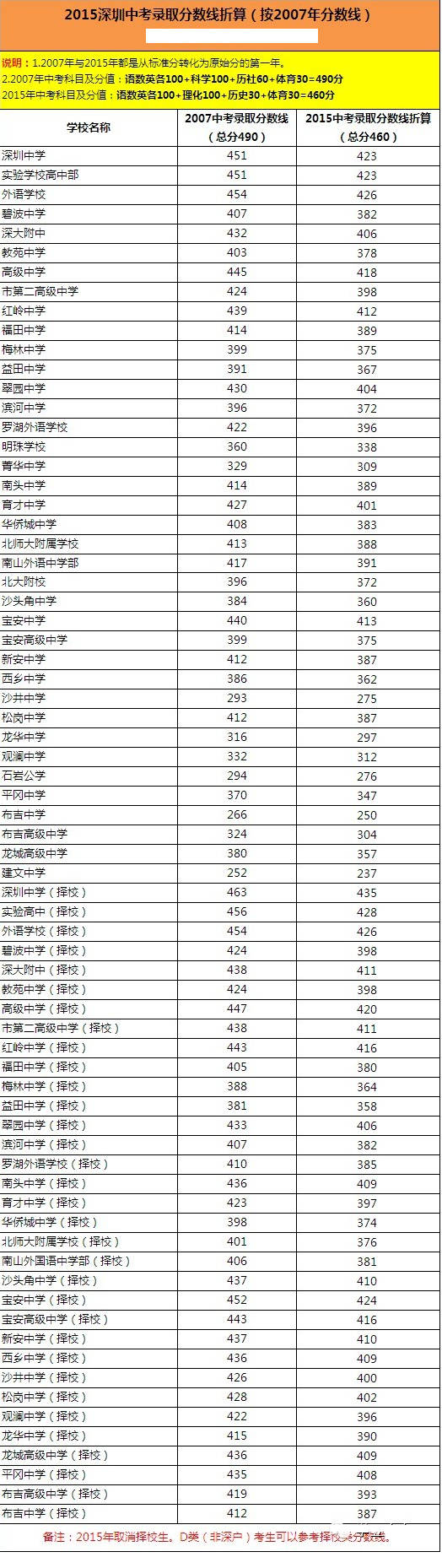 据2018招生信息网小编了解,深圳中考录取分数线都是从标准分转化为原始分进行录取工作的。2015年和2007年一样,都是从标准分录取转化为原始分录取的第一年(2008-2014都是按标准分录取,原始分没有公布)。因此,2007年的录取分数线对2015年具有一定参考性。具体的分数线划分情况如下所示: