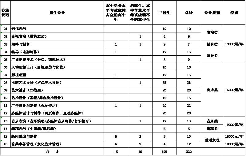 2015年学院自主招生计划220名,其中高中学业水平考试成绩齐全的应届高中生15名,历届高中生与学业水平考试成绩不全的应届高中生10名,三校生195名。