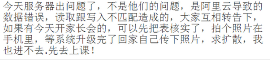 今天服务器出问题了,不是他们的问题,是阿里云导致的数据错误,读取跟写入不匹配造成的,大家互相转告下,如果有今天开家长会的,可以先把表核实了,拍个照片在手机里,等系统升级完了回家自己传下照片,求扩散,我也进不去.先去上课!