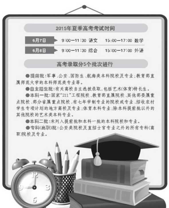 5月18日,山东省教育厅公布《山东省2015年普通高等学校考试招生(夏季高考)工作实施意见》。根据意见,今年高考于6月7日至8日进行,语文、数学、文综、理综由我省自行命题,外语由教育部命题。文化课成绩于6月25日前公布。