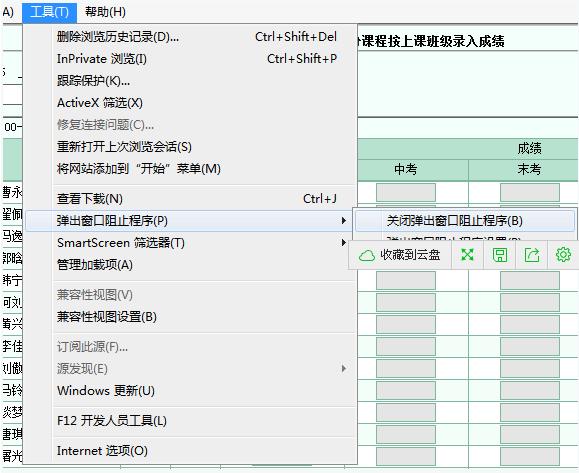 3、关闭IE弹出窗口功能:工具——弹出窗口阻止程序——关闭弹出窗口阻止程序。