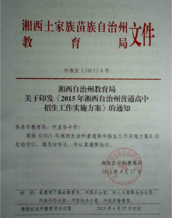 根据教育部《关于深入推进和进一步完善中考改革的意见》(教基〔2008〕6号)、《关于2013年深化教育领域综合改革的意见》(教改〔2013〕1号)、《关于2014年规范教育收费治理教育乱收费工作的实施意见》(教办〔2014〕6号)、湖南省教育厅《关于进一步规范普通中小学招生工作的通知》(湘教发〔2010〕29号)和湘西自治州教育局《关于进一步规范义务教育和高中阶段学校招生工作的通知》(州教发〔2011〕13号)等有关文件精神,为切实做好全州2015年普通高中招生工作,制定本方案。
