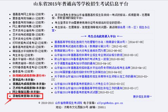 2015山东高考信息平台录取查询系统入口网址:http://wsbm.sdzk.gov.cn 点击进入山东教育招生考试院信息平台官网 山东省普通高校招生各类统一考试的报名、成绩查询、志愿填报、录取查询的指定平台