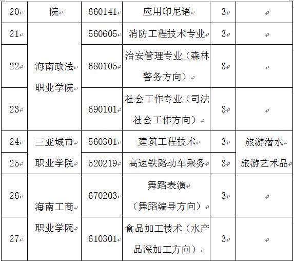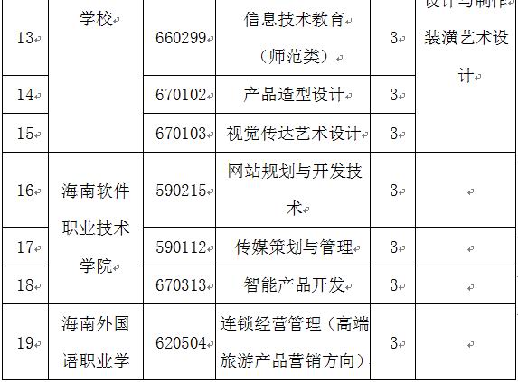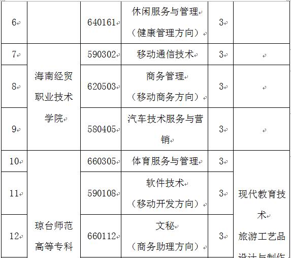 国际旅游岛商报从海南省教育厅获悉,海南省2014-2015学年度高职高专院校新增专业评审工作已经结束。今年,海南省共有11所高职高专院校申请增设全日制高职高专专业(含方向)42个。经专家评议和海南省教育厅研究决定,同意对11所高职高专院校申请增设的38个专科专业(含方向)予以备案。新增设的专业(含方向)于2015年开始招生。同时,撤销“国际贸易实务”等9个专业。