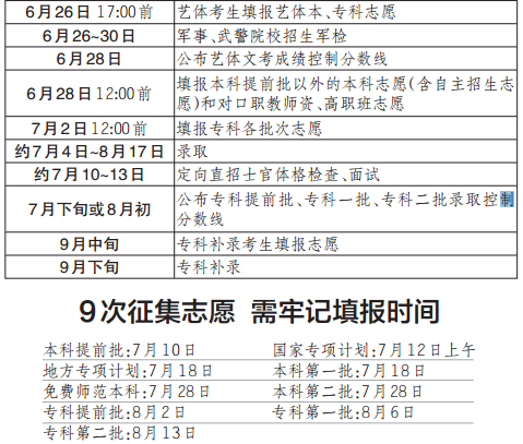 本科提前批:7月10日 国家专项计划:7月12日上午