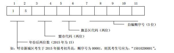 考生号由11位数字字符组成,照相确认后由系统自动生成,前两位代表年份,接下来的四位是盟市代码和旗县区代码,最后五位是顺序号,顺序号由旗县区招生机构分配。对一个旗县区来说顺序号范围为00001-99999,每位考生的顺序号不能重复。