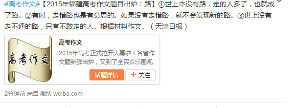 据爆料,2015年福建高考作文题目为:路。2018招生信息网小编目前正在核实中