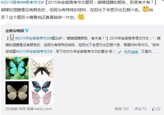 2015安徽高考作文题目公布:蝴蝶翅膀颜色到底有木有