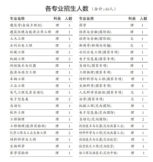 昨天,清华大学公布了今年在黑龙江省的招生计划,计划招生45人,与去年计划招生51人相比,略有减少。今年新增在黑龙江省招生的专业有:生物科学、医学实验班、药学、新闻学。另外,备受考生、家长关注的清华大学自主招生初试定于6月12日9时至11时,时间上完全与其他高校错开。清华是唯一在全国开设自主选拔初试考点的高校,黑龙江的考点在哈尔滨金融学院。