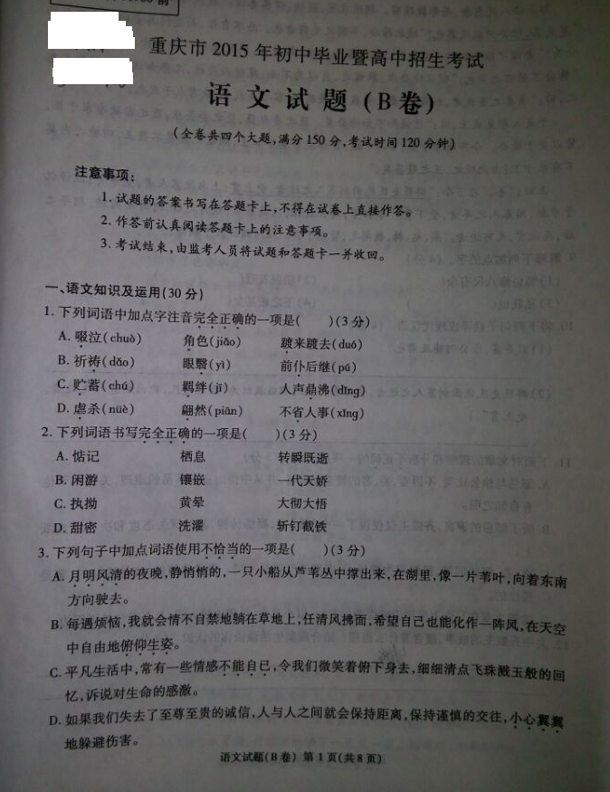 2015年重庆市中考语文试题(B卷,扫描版,无答案)