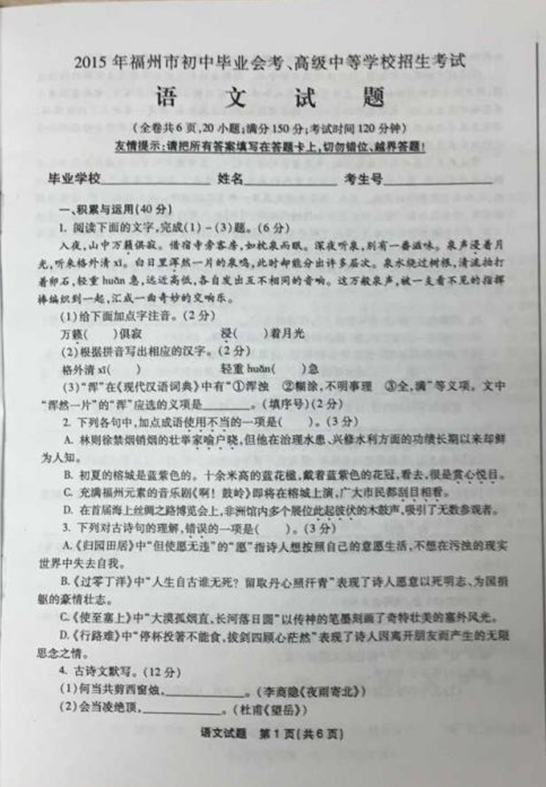 2015年福建省福州市中考语文试题及答案(扫描版)