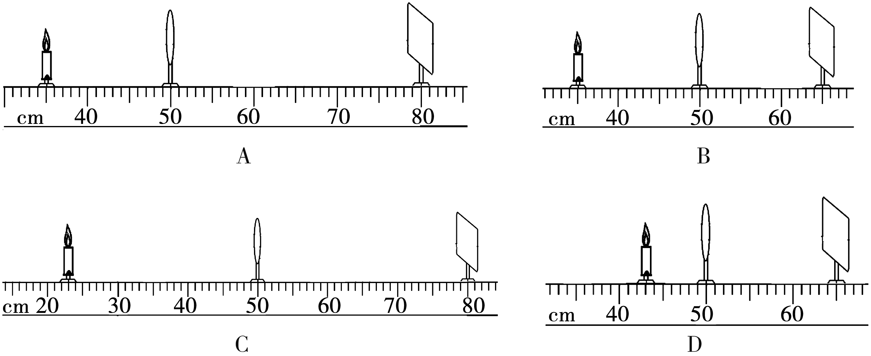 2. 小夏用图1中的凸透镜探究成像规律,在图2的四个实验情景中,能够在光屏上得到清晰像的是 A