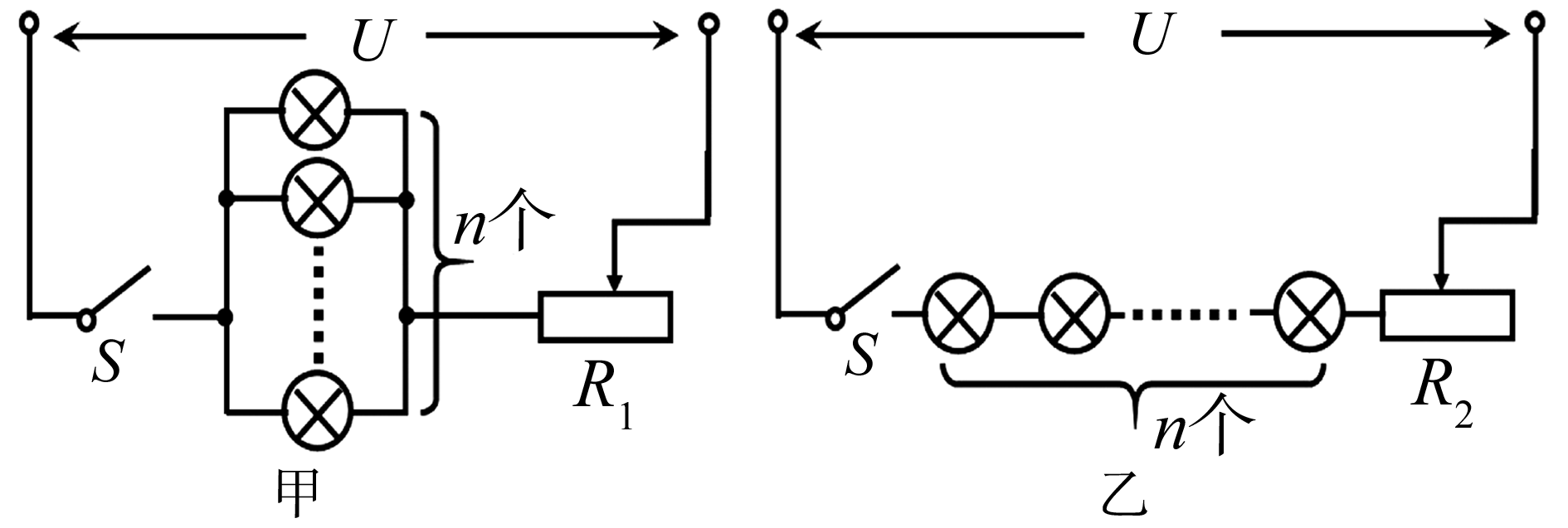 10. 小夏将n个“3V 0.3W”的小灯泡,按照甲、乙两种连接方式分别接入电压为U的电路中(如图9所示),通过分别调节滑动变阻器R1和R2,使所有灯泡均正常发光。则甲、乙两电路中的总电流与总功率的关系正确的是?C