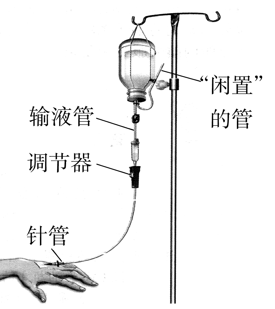14.护士给病人输液时,药水瓶上插着两根管,一根给病人输液,另一根通过瓶盖扎进瓶内药水中,如图12所示。这根“闲置”管是为了利用 大气压 。由于针头较细,为确保药液的流速,需要将药水袋提升到相对针管一般不低于1.3m的高度,