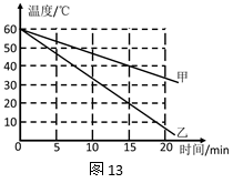 15.小夏在探究“物质的放热能力与哪些因素有关”时,分别用质量相等的水和另一种液体进行了实验,并用图象对实验数据进行了处理,如图13所示。实验中,水和另种液体在相同时间内放出的热量相等。分析图象可以得出:
